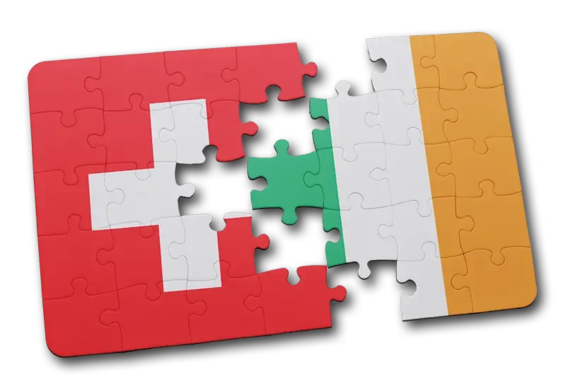 Puzzle pieces forming the flags of Switzerland, Kenya, and Ivory Coast.